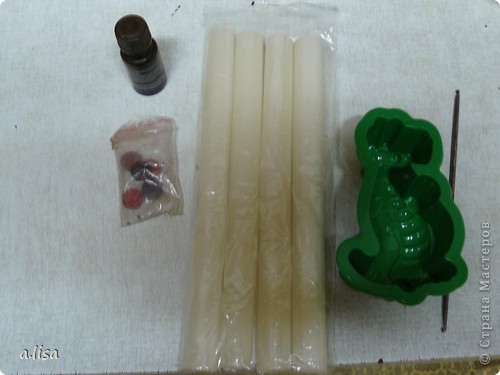 Здравствуйте дорогие жители страны! Бродя по ее бескрайним просторам, обратила внимание на, что МК по изготовлению цветных свечей нет. Попробую поделиться своим опытом, но не судите строго, это мой первый МК. Ну начнем. У нас все готово: свечи, форма, масло ароматическое, пищевой краситель в таблетках ( остался еще с пасхи), и палочка для размешивания краски ( у меня в данном случае старый крючок для вязания)